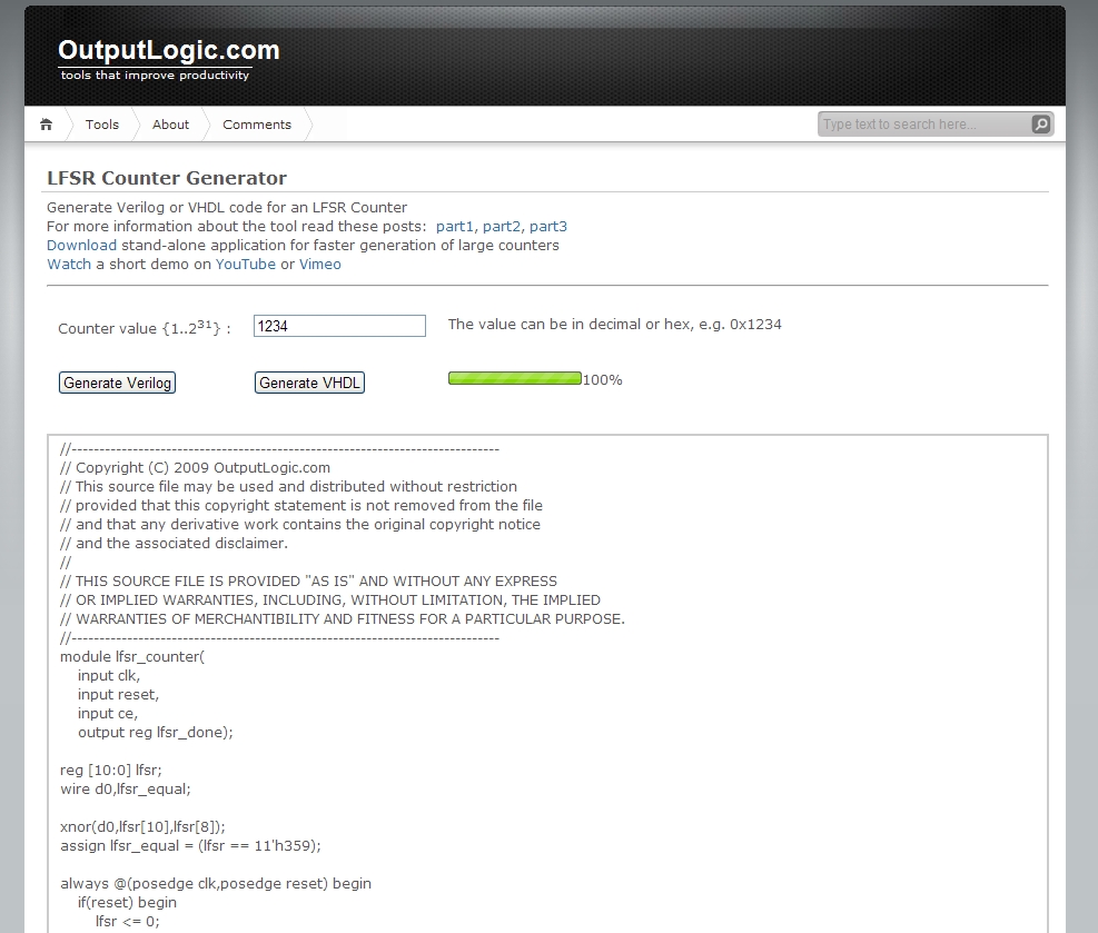 | Online LFSR Counter Generator | Show | Link | 2009-07-09 21:59 |